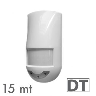 DT2000 è un sensore doppia tecnologia (MW + IR) dalle elevate performance e con un ottimo rapporto prestazioni/investimento. DT2000 offre una copertura fino a 15 metri e l’elevata qualità è certificata dalla garanzia di 5 anni.L’impiego di un sensore PIR digitale garantisce un’elevata immunità ai disturbi e una precisa rivelazione delle condizioni di allarme. Il sensore IR è dotato di una lente FRESNEL con protezione dalla luce bianca mentre la sezione MW è provvista di un’antenna planare DRO a basso assorbimento e di un dispositivo di antimascheramento. DT2000 vanta anche la funzione antistrisciamento. Inoltre l’adozione della completa gestione a microprocessore consente un’analisi accurata dell’ambiente, utilizzando sofisticati algoritmi di calcolo. Il design piacevole, le dimensioni compatte e la possibilità di montaggio ad angolo rendono DT2000 adatto a qualsiasi contesto. Dimensioni: L 65 x H 111 x P 48 mm. Assorbimento: 13mA (a riposo), 13mA (in allarme), 11mA (MW esclusa). Alimentazione: 12V (da 9 a 15V).