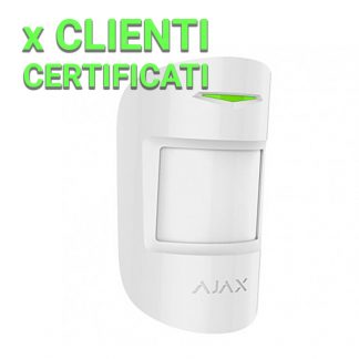 Rilevatore PIR doppia tecnologia - Ajax Superior. Alimentazione 1 batteria Panasonic CR123A da 3,0 V. Supporto con vite di fissaggio. Jeweller wireless 868 MHz. Portata di rilevamento 12 m. Certificato di grado 2. Dimensioni (senza supporto): 110 (H) x 65 (L) x 50 (P) mm. Colore bianco.