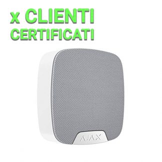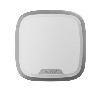 Sirena per interni - Ajax Superior. Alimentazione 2 pile CR123A 3.0 V Panasonic. Staffa con vite di fissaggio. Senza fili 868 MHz Jeweller. Pressione sonora massima 105 dB / Suono regolabile Certificato grado 2. Dimensioni: 75 (L) x 75 (H) x 27 (P) mm. Colore bianco.