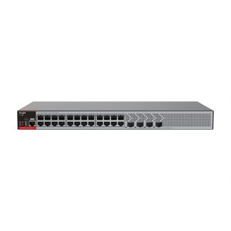 Ruijie Switch PoE Cloud Managed L2+ 24 porte RJ45 GE + 4 porte SFP 2.5Gigabit, 24 Porte PoE+ / Fino a 370W potenza totale, VLAN/QinQ/STP/RSTP/ACL/QoS/RIP/Static Routes, LACP/DHCP. Snooping/IGMP. Snooping/802.1x/SNMP. Montaggio su rack. Alimentazione: 100V AC fino a 240V AC, 50 Hz a 60 Hz. Dimensioni: 292 x 440 x 43,6 mm.