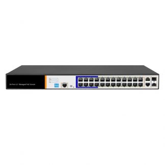 Switch 24 PORTE POE Managed 100 Mbps + 2 porte combo Gigabit, 1 porta console. 5 modalità di lavoro: commutazione standard, AI VLAN, AI Extend, AI PoE, modalità AI QoS. Supporto HI PoE, IEEE802.3af / at, Max.46W potenza uscita singola porta. Potenza totale: 300 W. 26 LED Link / Act24 LED POE 1 LED di sistema 1 LED di alimentazione. Porte di comunicazione protette da scariche elettriche 6KV. Dimensioni LxHxP 440 × 180 × 44 mm.