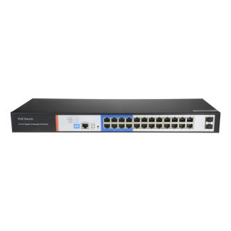 Switch PoE 24 PORTE PoE + 2 Gigabit SFP. Velocità 10/100/1000 Mbps, 46 W per porta / Massimo 250W. Modalità TVCC: fino a 250m di portata. Norma IEEE802.3at (PoE) / af (PoE+). Alimentazione: AC 100 V - 240 V. Dimensioni: 293 (P) x 44 (H) x 293 (L) mm.