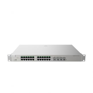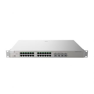 Ruijie Switch PoE Cloud Managed L2+ 24 porte RJ45 GE + 4 porte SFP 2.5Gigabit, 24 Porte PoE+ / Fino a 370W potenza totale, VLAN/QinQ/STP/RSTP/ACL/QoS/RIP/Static Routes, LACP/DHCP. Snooping/IGMP. Snooping/802.1x/SNMP. Montaggio su rack. Alimentazione: 100V AC fino a 240V AC, 50 Hz a 60 Hz. Dimensioni: 292 x 440 x 43,6 mm.