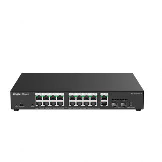 Switch PoE Cloud Managed Reyee , 16 PoE 802.3af/at + 2 SFP + 2 uplink RJ45, 18 RJ45 10/100/1000Mbps + 2 SFP 10/100/1000, 30W per porta 802.3af/at / Massimo 250W, VLAN/Port Isolation/Loop Detection. Limite di Velocità della Porta. Alimentazione: 100~240 V con adattatore esterno. Dimensioni: 223 (P) x 43.6 (L) x 300 (H) mm.