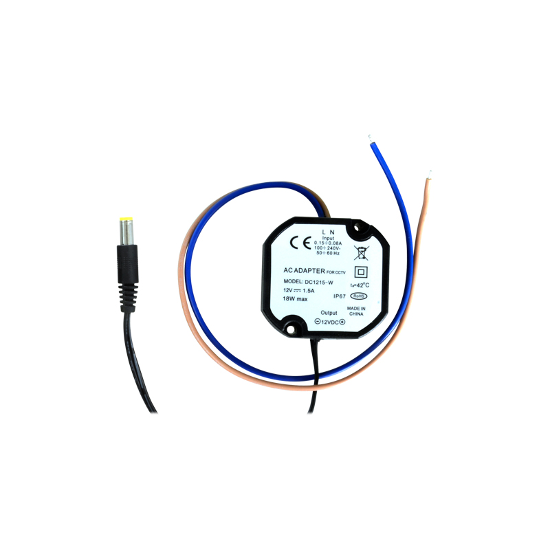 Alimentatore elettronico, ingresso: 100-240 V 50/60 HZ 0.5 A, uscita: 12 V / 1500 mA. Dimensioni ridotte 46x46x25 cm. Stabilizzato IP67.