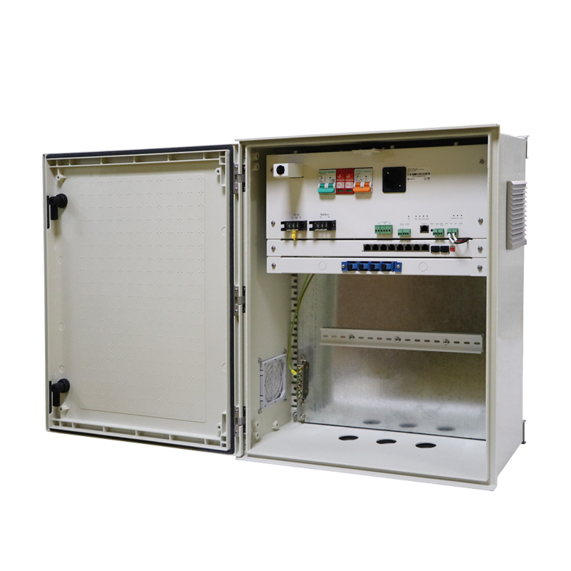 Armadio in poliestere con switch e alimentatore incluso. Dimensioni esterne 60x50x23cm. Switch di 8 porte. Vassoio per fusione fibra. Piattaforma di gestione e manutenzione. Grado di protezione IP55 / Guida DIN / UPS. Ingresso alimentazione: AC 100~240V, 50/60Hz. Materiale: SMC (resina poliestere rinforzata con fibra di vetro). Guida DIN inclusa. Colore bianco.