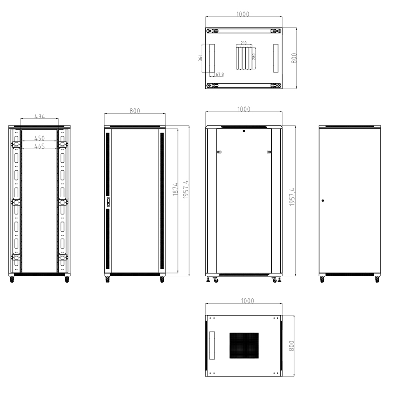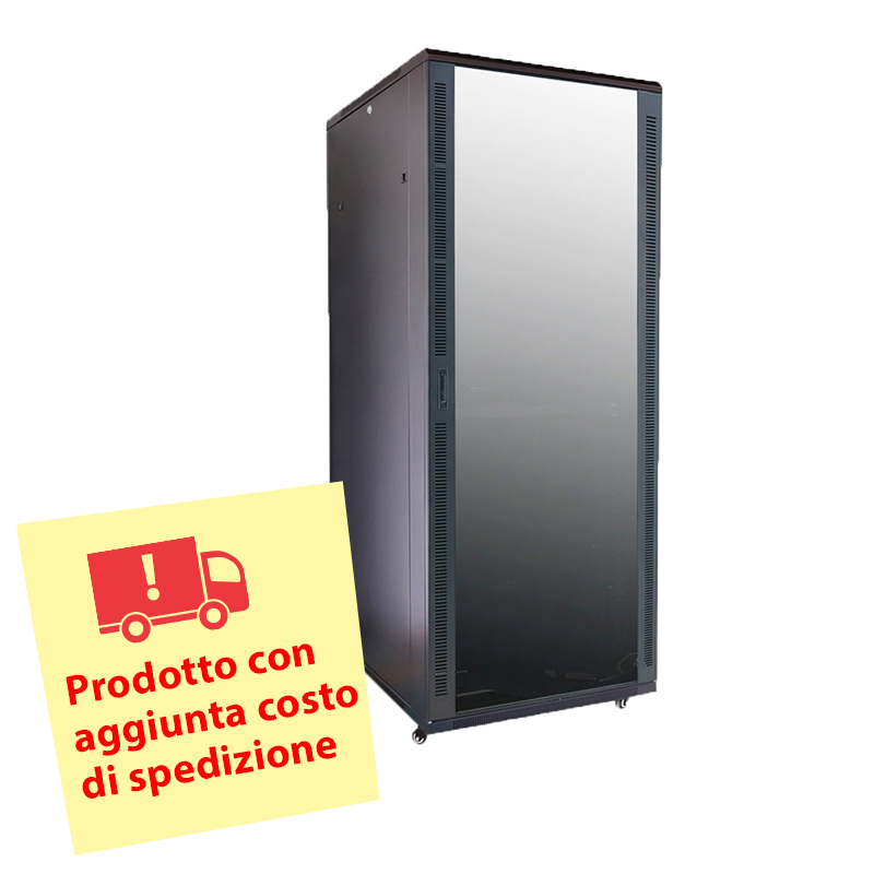 Armadio rack per pavimento, fino a 42U rack da 19″(800*1000). Fino a 800 Kg di carico. Con ventole e passacavi, 4 ventole, 2 vassoi e PDU 6 prese. Fornito assemblato. Dimensioni esterne: 1957.4 (H) x 800 (l) x 1000 (P) mm (Altezza senza ruote). Colore nero, acciaio SPCC.