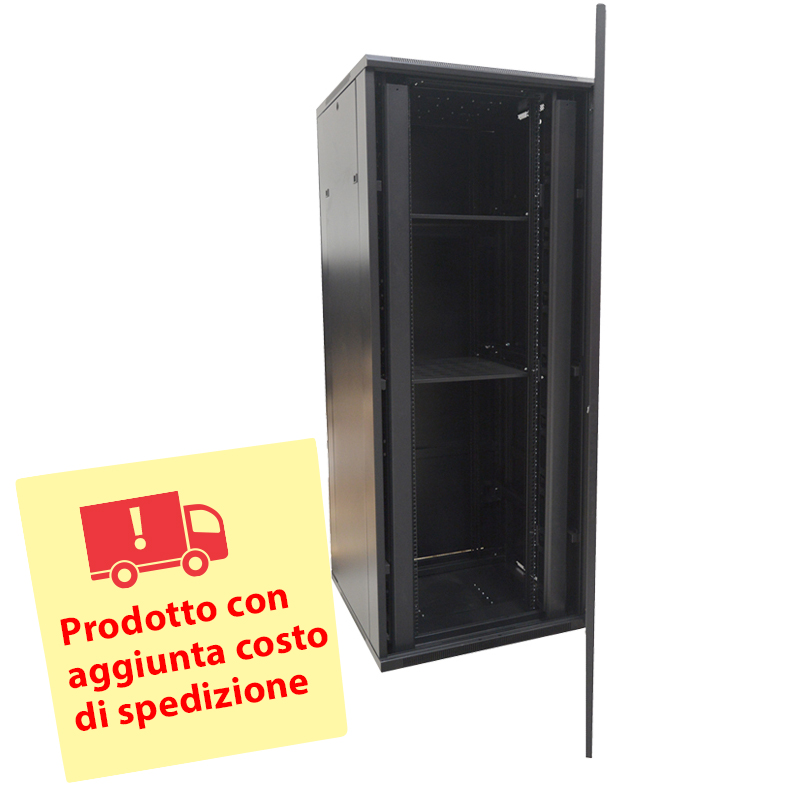 Armadio rack da pavimento Rack 19″, disponibile fino a 42U + 12U verticale. Carico fino a 800 kg. Con ventilazione e pressacavo, 4 ventole, 2 vassoi e 6 uscite PDU. Fornito assemblato. Porta frontale in vetro temperato con serratura. Porta posteriore in metallo con serratura. Pannello laterale rimovibile. Parte inferiore e anteriore ventilate per il raffreddamento. Dimensioni esterne: 1980 (A) x 800 (L) x 800 (P) mm.