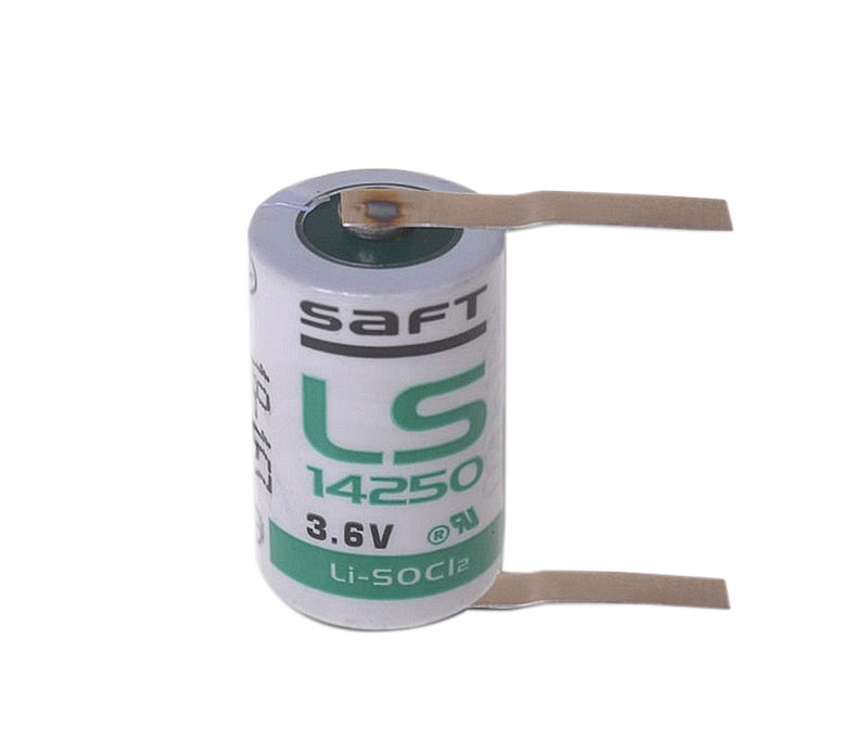 Batteria litio SAFT 3,6V 1200mAh, formato 1/2AA con terminali piatti a saldare. Prezzo per singola batteria (vassoio da 50pz) contr. cobat DLgs n.188/08 art.13
