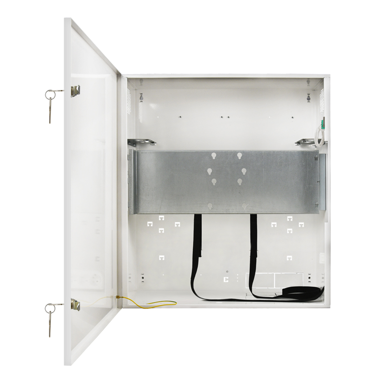 Box metallico BIANCO universale per DVR e MONITOR, dimensioni LxHxP 585 x 650 x 261mm, dimensioni interne LxHxP 480 x 400 x 180 [+/-2 mm]. Installazione DVR VERTICALE, con fasce di bloccaggio. Chiusura a doppia chiave. Accessori per raffreddamento ventole GELID-SIL8BK e termostato TM-1.