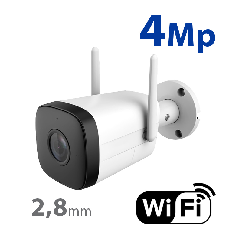 Telecamera bullet IP Wifi 4 Mp, 1/3” Progressive Scan CMOS. Compressione H.265+. Lente 2.8 mm. IR LEDs portata 30 m, WEB, DSS/PSS, Smartphone e NVR. Audio: Microfono integrato e altoparlante. Registrazione su scheda SD fino a 128 GB. Alimentazione: DC 12 V / 6.2 W. Dimensioni: 180 mm (H) x 83.3 mm (L) x 114.8 mm (P).