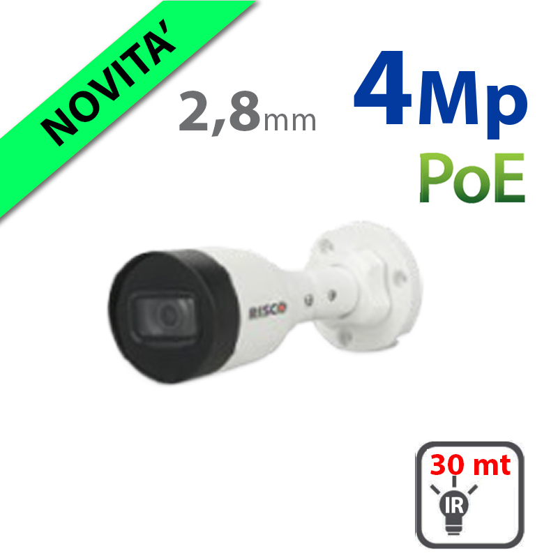 Telecamera IP Bullet da esterno/interno, P2P, IP67, 4MP, H.265, 2.8mm/F2.0, ePoE, illuminatore IR da 30m, senza alimentatore. Alimentazione: DC12V/PoE Max. 5.0W. Dimensioni: 162,6 mm (L) x 70 mm (ø). Compatibile con: RVIM0A134, PFA134 PFA130-E junction box; RVIM3A152 supporto da palo.
