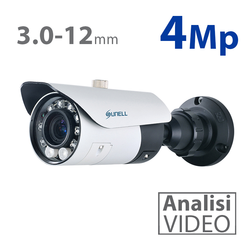 Bullet IP 4Mp 2688×1520@15fps. Sensore da 1/3″ Progressive Scan CMOS. Ottica VARIFOCAL da 3-12mm. 2 Led IR Array + 8 Led Piranha 20-25m. Slot per memorie SD/SDHC/SDXC da max 64 GB. Ananlisi video on-board: Motion Detector, attraversamento