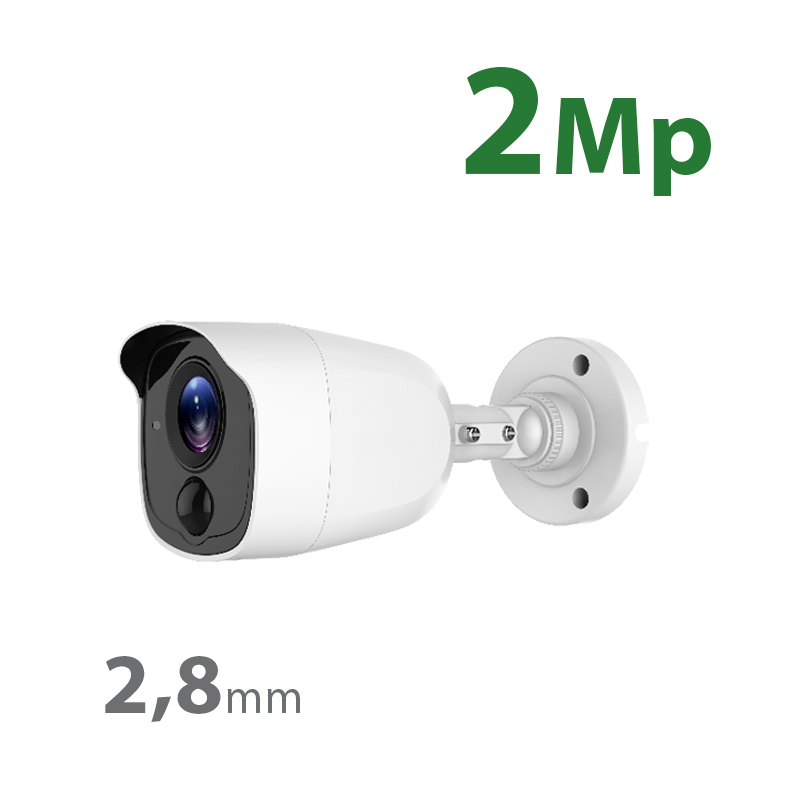 Bullet HDTVI PRO 2 Mp 2,8 mm, HDTVI Ultra Low Light High Performance CMOS, Lente 2.8 mm | WDR, 3D-NR, IR-CUT, IR LEDs portata 20 m. Rivelatore PIR reale con allarme inviato al registratore compatibile Safire tramite cavo coassiale. PIR reale fino a 11 metri. Alimentazione: DC 12 V / 375 mA max. 68 x 70 x 179,8 mm (HxLxP).