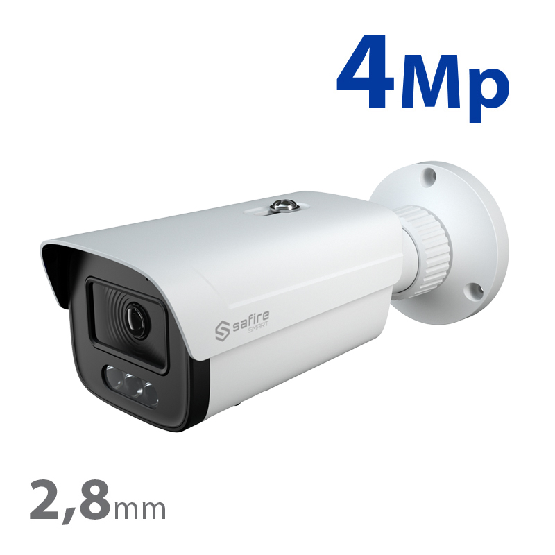 Bullet IP Safire SAFIRE SMART gamma I1 con deterrenza attiva. Risoluzione 4 Mp (2566×1440). Lente 2,8 mm | MIC e altoparlante | Doppia luce 40m. AI: classificazione di esseri umani e veicoli. Impermeabilizzazione IP67. Dimensioni: 217,8 (P) x 80,5 (L) x 80,3 (H) mm. Alimentazione: DC 12 V / 1000 mA / 12 W max. /PoE IEEE802.3af. Compatibile con: DS-1280ZJ-S, SF-JBOX-0104, SF-JBOX-0301, SF-JBOX-0103 junction box.