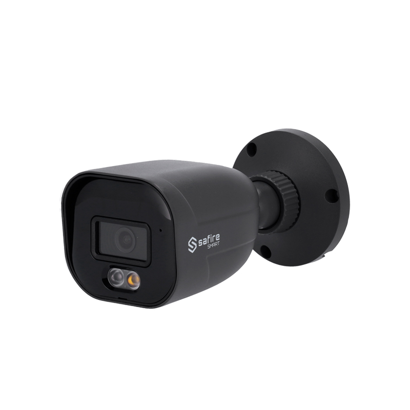 Telecamera bullet IP SAFIRE SMART gamma E1 IA. Risoluzione 4 Megapixel (2566×1440). Ottica 2.8 mm | Microfono integrato | DL 30m. IA: Classificazione di persone e veicoli. Waterproof IP67, P2P. Colore Grigio. Alimentazione: DC 12 V / 6 W max. / PoE IEEE802.3af. Dimensioni: 94.6 (Ø) × 82.8 (H) mm. Compatibile con: SF-JBOX-0103, SF-JBOX-0301, SF-JBOX-0104 junction box; SF-WB-0301+0406, SF-CB-0301+0810 staffa da soffitto; SF-PB-0103+0501 staffa da palo.