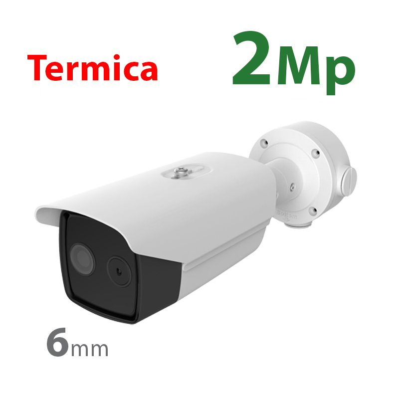 Bullet termica Dual IP 2Mp 6mm Safire. 2IN/2OUT allarme. Sensore ottico 1/2.7” 2 Mpx, Sensibilità termica ≤ 40mK. Rilevazione antincendio e allarme. Gamme VCA: Rilevamento Persona 60m, Rilevamento veicolo 240 m. Intervallo di misurazione della temperatura -20~150ºC / ± 8ºC. PoE IEEE802.3af. Registrazione su scheda SD. Interface WEB, CMS (DSS/PSS), Smartphone e NVR. Compatibile con ONVIF. Staffa inclusa. Dimensioni 315,3 x 106 x 107 mm.