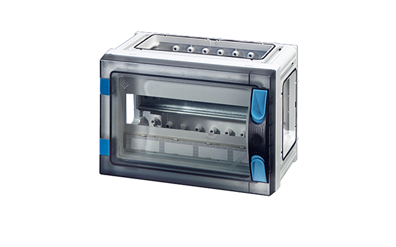 Centralino per 12 moduli DIN 1x12x18mm, in policarbonato, misura 1, SENZA pareti laterali,coperchio trasparente e maniglia di chiusura. Dimensioni esterne 270x180x186mm. LxHxP
