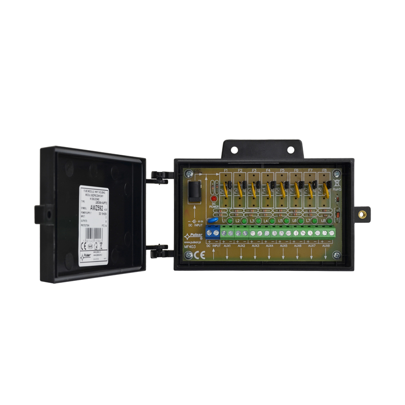 Circuito distribuzione e sezionamento tensione per 8 linee. Consente di dividere e proteggere 8 linee di alimentazione ognuna con fusibile. Segnalazione Led rottura fusibile. Morsettiera per cavi max 2mmq. Possibilità di montaggio su guida DIN con accessorio PKAZ107. In contenitore plastico. Dimensioni LxHxP 150x94x42mm