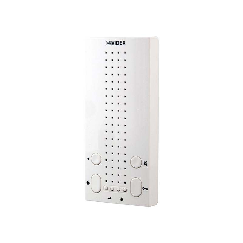 Citofono serie 5000 viva voce per sistema VX2300. 4 pulsanti “Relè di Bus (Art. 2305)”, “Risposta/Fine conversazione/PTT/Auto-accensione”, “Privacy”, “Apri porta/Chiamata intercomunicante”. Montaggio in superficie, finitura bianco lucido, supporto da tavolo Art. 5138. Dimensioni: 74 x 164 x 23,50 mm (L x H x P).