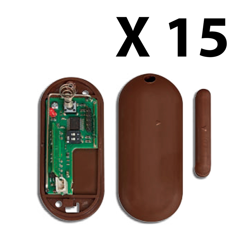 Confezione da 15 pezzi. Contatto magnetico MARRONE radio monocanale 868 MHz FSK (compatibile con centrale dualband), supervisionato, segnalazione di stato. Per infissi non metallici. Tamper antiapertura. Assorbimento a riposo: 5 μA, assorbimento in trasmissione: 40 mA. Dimensioni LxHxP 81x34x19 mm. Batteria al litio SBT08 3,6V 1,2Ah in dotazione.
