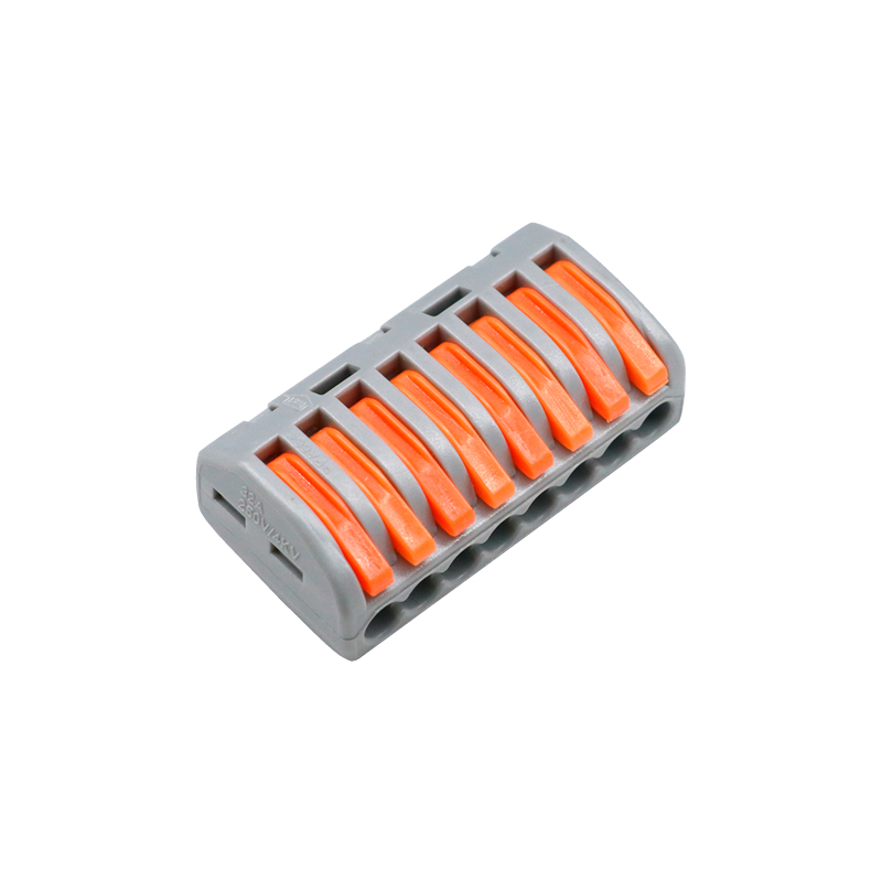 Connettore cavo Safire 1 Ingressi e 7 Uscite. Calibro del cavo 28 ~ 12AWG. Lunghezza striscia 10mm 10 unità. Colore: Grigio + arancione. Dimensioni: 40,5 (l) x 14.5 (H) x 20.5 (P) mm.