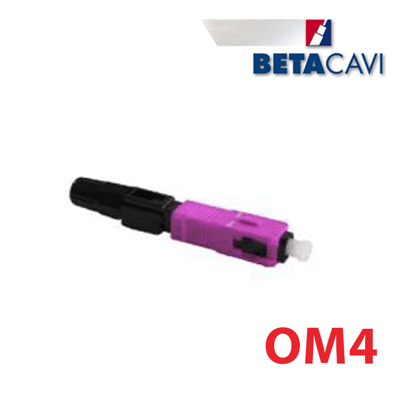 Connettore Multimodale OM4 prelappato SC/UPC per cavo da 3 mm. I connettori prelappati al loro interno contengono una fibra preinstallata in fabbrica che consente di eliminare le operazioni di lappatura e pulitura evitando l’utilizzo di resina in campo. Questa tipologia di connettori consente di raggiungere ottimi livelli di qualità, con una perdita di inserzione media di 0,2 dB, riducendo al minimo le problematiche che si incontrano nelle difficili condizioni di lavoro in campo.