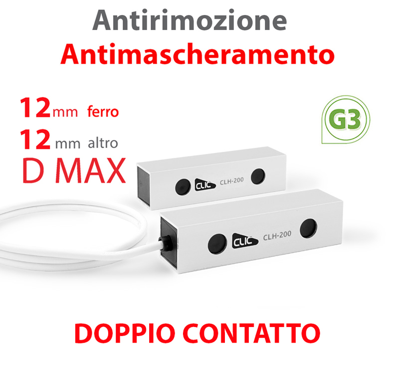 Contatto magnetico a vista ANTIMASCHERAMENTO e ANTIRIMOZIONE magnetico con cavo 2mt. Distanza di lavoro su ferro: 12mm, su altri materiali: 12mm. Brevetto MAGNASPHERE. Doppio contatto. Alta tolleranza, tamper passante. Installabile in esterno. Scocca in alluminio anodizzato ad alta resistenza. Montaggio in linea o ad angolo retto senza necessità di staffe accessorie. Certificazione EN50131-2-6 grado3 classe IV. Dimensioni magnete e contatto LxHxP 100x25x25mm.