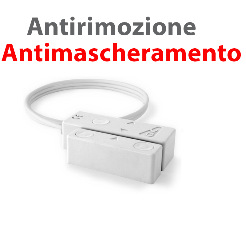 Contatto magnetico a vista ANTIMASCHERAMENTO e ANTIRIMOZIONE BIANCO con cavo 2mt. Distanza di lavoro su ferro: 15mm, su altri materiali: 15mm. Brevetto MAGNASPHERE. Alta tolleranza, tamper passante. Installabile in esterno. Scocca in tecnopolimero rinforzato con fibra di vetro. Coprivite anti-manomissione. Distanziali contatto e magnete a corredo. Possibilità di uscita cavo dal retro del sensore. Certificazione EN50131-2-6 grado 3 classe IV. Dimensioni contatto LxHxP 64×22,5×22,5 e magnete LxHxP 51,5×14,3x22mm. Il prezzo si riferisce al singolo contatto. Venduto in confezione da 2 pezzi.