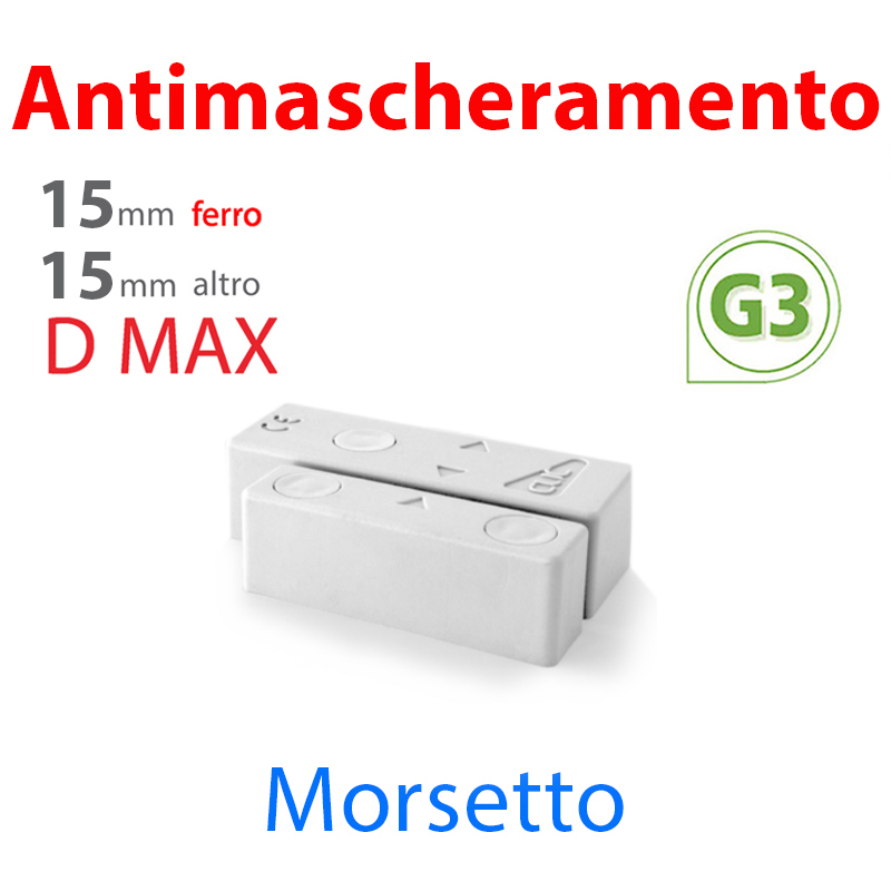Contatto magnetico a vista ANTIMASCHERAMENTO BIANCO con morsettiera. Distanza di lavoro su ferro: 15mm, su altri materiali: 15mm. Brevetto MAGNASPHERE. Alta tolleranza, tamper passante. Scocca in tecnopolimero rinforzato con fibra di vetro. Coprivite anti-manomissione. Distanziali contatto e magnete a corredo. Possibilità di uscita cavo dal retro del sensore. Certificazione EN50131-2-6 grado 3 classe II. Dimensioni contatto LxHxP 64×22,5×22,5 e magnete LxHxP 51,5×14,3x22mm. Il prezzo si riferisce al singolo contatto. Venduto in confezione da 2 pezzi.