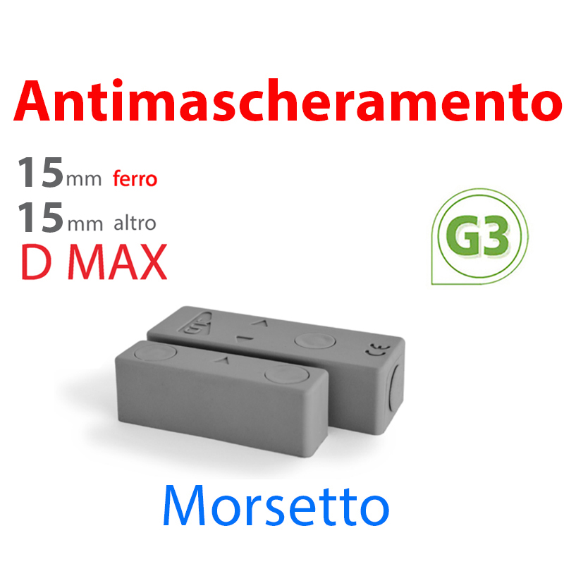 Contatto magnetico a vista ANTIMASCHERAMENTO GRIGIO con morsettiera. Distanza di lavoro su ferro: 15mm, su altri materiali: 15mm. Brevetto MAGNASPHERE. Alta tolleranza, tamper passante. Scocca in tecnopolimero rinforzato con fibra di vetro. Coprivite anti-manomissione. Distanziali contatto e magnete a corredo. Possibilità di uscita cavo dal retro del sensore. Certificazione EN50131-2-6 grado 3 classe II. Dimensioni contatto LxHxP 64×22,5×22,5 e magnete LxHxP 51,5×14,3x22mm. Il prezzo si riferisce al singolo contatto. Venduto in confezione da 2 pezzi.