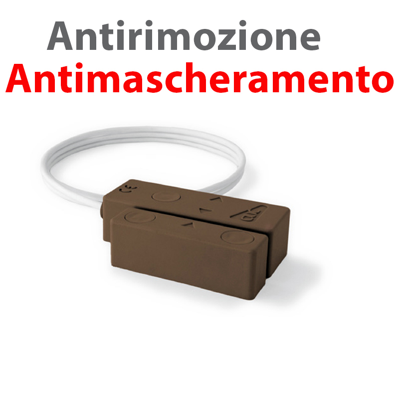 Contatto magnetico a vista ANTIMASCHERAMENTO e ANTIRIMOZIONE MARRONE con cavo 2mt. Distanza di lavoro su ferro: 15mm, su altri materiali: 15mm. Brevetto MAGNASPHERE. Alta tolleranza, tamper passante. Installabile in esterno. Scocca in tecnopolimero rinforzato con fibra di vetro. Coprivite anti-manomissione. Distanziali contatto e magnete a corredo. Possibilità di uscita cavo dal retro del sensore. Certificazione EN50131-2-6 grado 3 classe IV. Dimensioni contatto LxHxP 64×22,5×22,5 e magnete LxHxP 51,5×14,3x22mm. Il prezzo si riferisce al singolo contatto. Venduto in confezione da 2 pezzi.