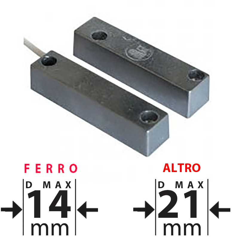 Contatto magnetico in alluminio pressofuso IP65 per il montaggio a vista. Distanza massima di lavoro 21mm no ferro, 14mm ferro. Elevata resistenza meccanica. Funzionamento con contatto reed uscita NC con magnete vicino. Connessione a cavo (2 per contatto + 2 per tamper). Cavo 1,2mt. Dimensioni LxHxP 80x19x18mm. Dotazione: tappi antisvitamento, pressacavo, tamper, distanziale in plastica. Il prezzo si riferisce al singolo contatto. Venduto in confezione da 2 pezzi