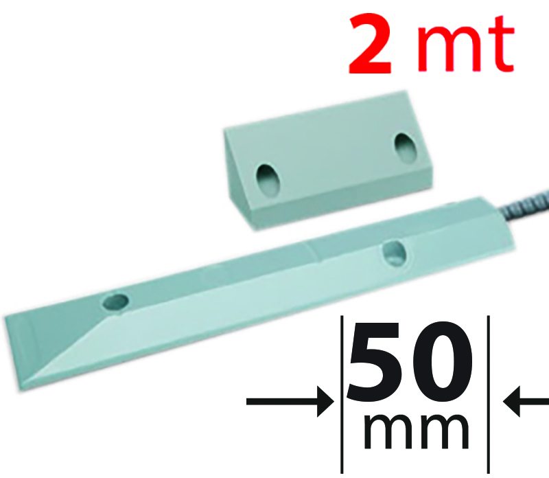 Contatto magnetico CALPESTABILE in alluminio con vernice protettiva GRIGIA per PORTE BASCULANTI o SCORREVOLI con cavo 2 mt. Distanza massima di lavoro 50mm. IMPERMEABILE all’ACQUA DI MARE. La parte reed si fissa a pavimento con viti, mentre la parte magnete si fissa sulla porta. Guaina metallica per protezione cavo. Temperatura con cavo fissato –25…+70°C. Temperatura con cavo mobile –5…+ 50°C. Certificazione EN 2, G 191525, Vds B. Dimensioni contatto LxHxP 230x45x13 mm, dimensioni magnete LxHxP 100x40x35 mm. Lunghezza guaina protezione metallica 0,5 m. IP68.