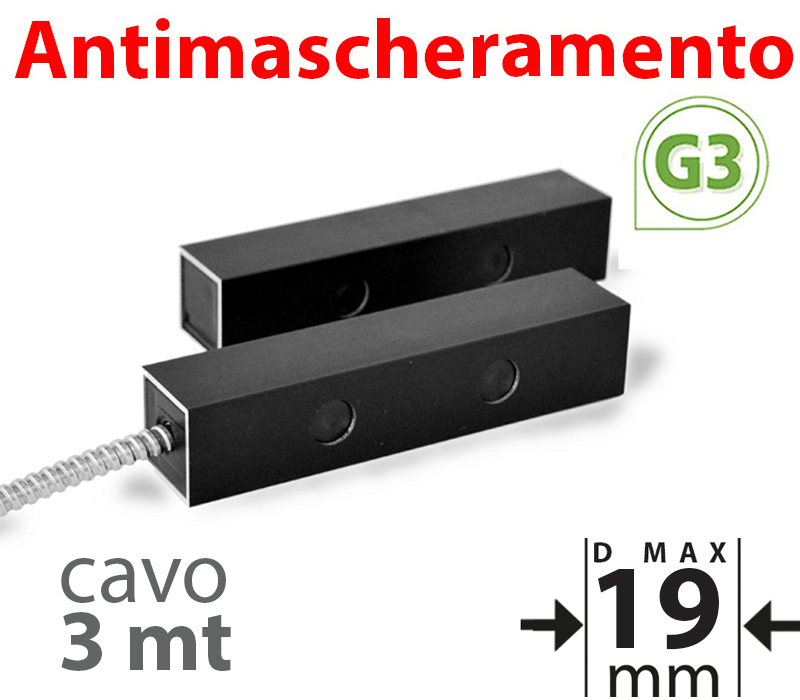 Contatto magnetico a vista AD ALTA TOLLERANZA con cavo 3mt. dop.bil.4k7. Distanza di lavoro su ferro:19mm, su altri materiali: 19mm. Brevetto MAGNASPHERE Coded Sensor Technology permette di creare coppie di sensori e magnete codificati. Alta tolleranza. Scocca in ABS e alluminio anodizzato. Antimascheramento con apertura di circuito tamper indipendente dal contatto principale. Certificato EN50131-2-6 G3 classe IV. Dimensioni magnete e contatto LxHxP 120x25x25mm.