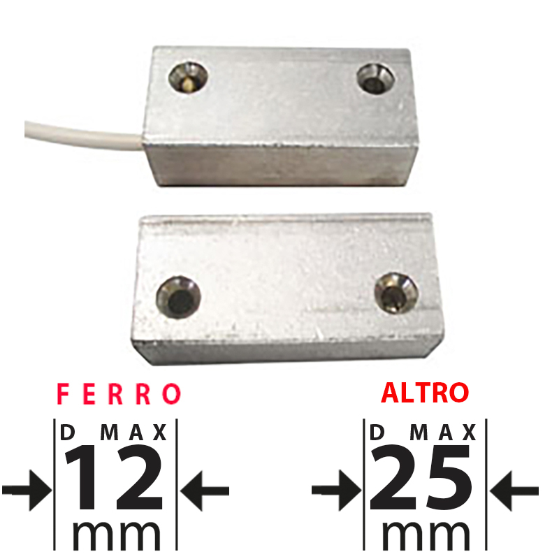 Contatto magnetico in metallo per montaggio a vista con elevata resistenza meccanica. Distanza massima di lavoro 25mm no ferro, 12mm ferro. Conforme con la normativa europea EN50131-2-6 grado 2 CL4. Dimensioni LxHxP 45x20x15mm. Lunghezza cavo 1m. Il prezzo si riferisce al singolo contatto. Venduto in confezione da 5 pezzi