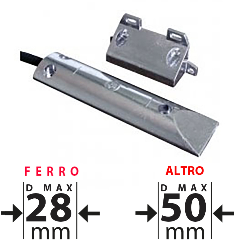 Contatto magnetico in alluminio pressofuso IP65 per porte basculanti o scorrevoli. Distanza massima di lavoro 50mm no ferro, 28mm ferro. La robusta struttura del contenitore completamente in alluminio garantisce la massima resistenza al passaggio delle ruote di automezzi pesanti e rende questo contatto adatto agli impieghi più gravosi. La parte reed si fissa a pavimento con tre viti, mentre la parte magnete si fissa sulla porta. Le ampie distanze d’intervento ne garantiscono il funzionamento anche con porte dai giochi elevati. La parte reed contiene una ampolla reed incapsulata ermeticamente con resina poliuretanica insieme ad un loop di tamper per ridurre le possibilità di effrazione. Funzionamento con contatto reed uscita NC con magnete vicino. Connessione a filo 2 per contatto + 2 per tamper. Lunghezza cavo 1,2mt. Dimensioni LxHxP contatto 180x45x14mm, LxHxP magnete 92x46x30mm. Guaina di protezione cavo diam. 10mm. lungh. 1mt. in acciaio ricoperto da PVC nero, fili tamper in dotazione