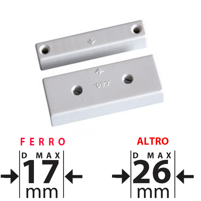 Contatto magnetico in termoplastico per montaggio a vista IP40. Distanza massima di lavoro 26mm no ferro, 17mm ferro. Adatto per il montaggio su infissi di qualsiasi materiale. protetto contro lo strappo dal muro e l’apertura del coperchio. Funzionamento con contatto reed uscita NC con magnete vicino. Connessione a 2 morsetti. Dimensioni LxHxP 62×23,5x14mm, magnete LxHxP 60x11x13mm. Il prezzo si riferisce al singolo contatto. Venduto in confezione da 10 pezzi