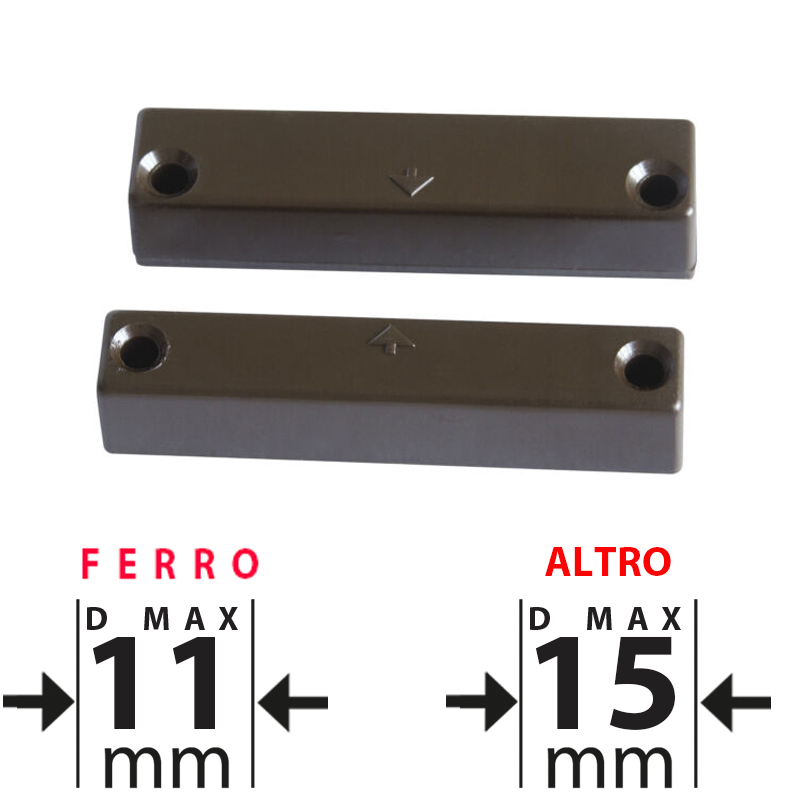 Contatto magnetico in termoplastico marrone per montaggio a vista IP40. Distanza massima di lavoro 15mm no ferro, 11mm ferro. Adatto per il montaggio su infissi di qualsiasi materiale. Funzionamento con contatto reed uscita NC con magnete vicino. Connessione a 2 morsetti. Dimensioni LxHxP 60×13,5x13mm, magnete LxHxP 60x11x13mm. Il prezzo si riferisce al singolo contatto. Venduto in confezione da 10 pezzi