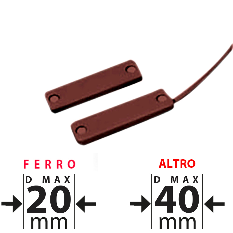 Contatto magnetico MARRONE per superficie di grande portata. Distanza massima di lavoro 40mm no ferro, 20mm ferro. Profilo estremamente ridotto sottile e stretto, adatto anche per installazioni su infissi in materiale ferromagnetico. Conforme alla normativa europea EN50131-2-6 grado 2 CL2. Dimensioni LxHxP 55x13x5mm. Lunghezza cavo 3m. Il prezzo si riferisce al singolo contatto. Venduto in confezione da 5 pezzi