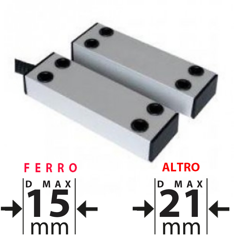 Contatto magnetico ad elevato livello di sicurezza per installazioni a vista in ambienti interni IP40. Distanza massima di lavoro 21mm no ferro, 15mm ferro. La serie 1000, con un elegante contenitore in alluminio anodizzato, è lo standard consolidato nei capitolati per sistemi antifurto di banche, centri commerciali e in tutti quegli ambienti dove è necessario avere la massima sicurezza sulla protezione perimetrale. E’ dotato di protezioni contro effrazioni di tipo magnetico, elettrico, meccanico. I circuiti magnetici a doppio bilanciamento, in cui le diverse ampolle reed si agganciano ai campi magnetici generati da batterie di magneti, vengono sbilanciati all’approssimarsi di un magnete esterno di effrazione attivando di conseguenza l’allarme. La protezione sui fili è garantita da un loop di tamper e da una guaina in acciaio plastificato. Funzionamento con contatti reed uscita NC. Connessione a 4 fili. Lunghezza cavo 2,0mt. Dimensioni LxHxP 114x35x20mm. Dotazione tappi antisvitamento, guaina di protezione cavo diam. 10mm lungh. 1,7mt in acciaio ricoperto da PVC nero, fili tamper, dime fissaggio