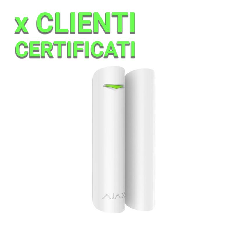 Contatto magnetico, Ajax Superior, 2 relè reed: installazione del magnete su entrambi i lati. Supporto con vite di fissaggio. Alimentazione 1 batteria Panasonic CR123A da 3,0 V. Jeweller wireless 868 MHz. Certificato di grado 2. Dimensioni: 90 mm (L) x 20 (Ø) mm. Colore bianco.