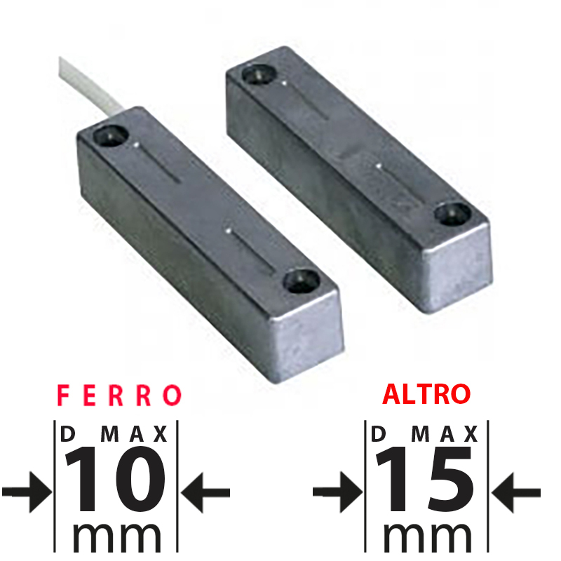 Contatto magnetico in SCAMBIO in alluminio per il montaggio a vista IP65. Distanza massima di lavoro 15mm no ferro, 10mm ferro. Elevata resistenza meccanica. Connessione a cavo (3 per contatto + 2 per tamper). Lunghezza cavo 1,2mt. Dimensioni LxHxP 80x19x18mm. Dotazione: tappi antisvitamento, pressacavo, tamper. Il prezzo si riferisce al singolo contatto. Venduto in confezione da 2 pezzi