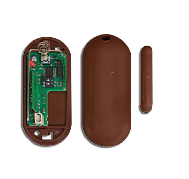 Contatto magnetico MARRONE radio monocanale 868 MHz FSK (compatibile con centrale dualband), supervisionato, segnalazione di stato. Per infissi non metallici. Tamper antiapertura. Assorbimento a riposo: 5 μA, assorbimento in trasmissione: 40 mA. Dimensioni LxHxP 81x34x19 mm. Batteria al litio SBT08 3,6V 1,2Ah in dotazione.