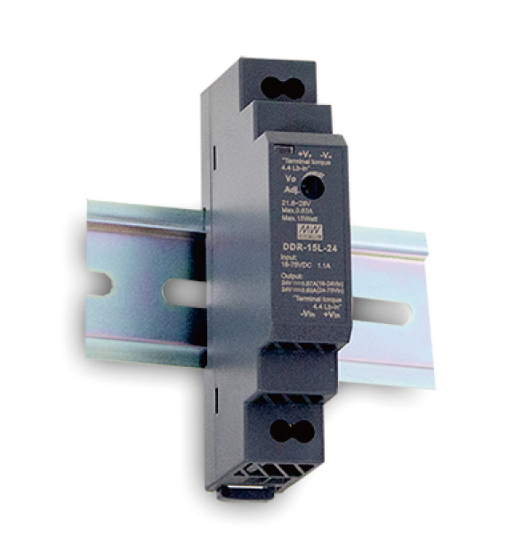 convertitore DC/DC 1,25A per guida DIN in 9-36Vcc out 9-13,2Vcc. Dimensioni LxHxP 17,5x90x54,5mm