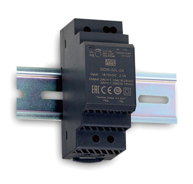 convertitore DC/DC 2,5A per guida DIN in 9-36Vcc out 9-13,2Vcc. Dimensioni LxHxP 35x90x54,5mm