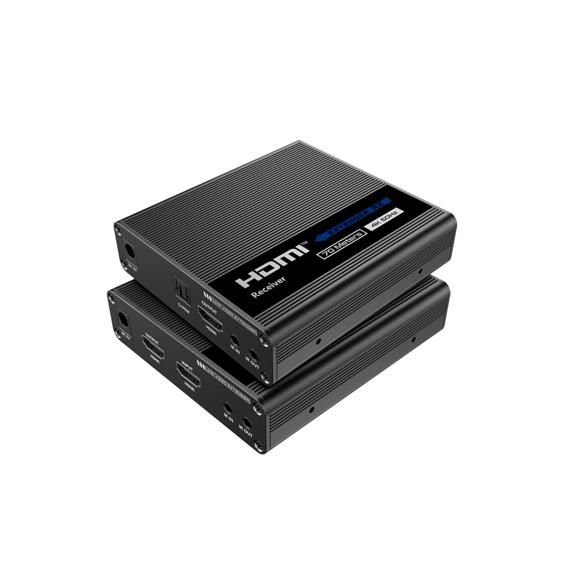 Coppia di estensori (TX e RX) di segnale HDMI tramite cavo di rete. Trasmettitore e ricevitore. Lunghezza massima 60 metri. Supporta risoluzione 4K. Standard HDbitT. Include trasmissione IR (per telecomando a distanza). Alimentazione: 2 x DC 5 V / 1A. Dimensioni: 2 x 22.66 (H) x 77.49 (L) x 56.15 (P) mm.