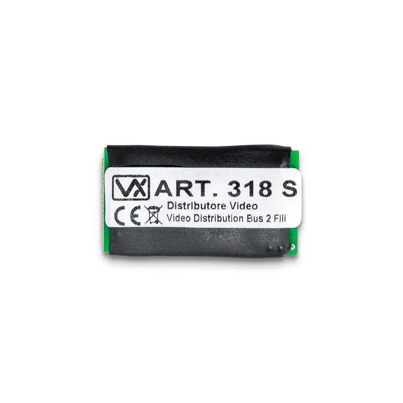 Distributore video passivo, 2 out per sistema VX2300. Distributore video passivo a 2 vie, versione compatta. Può essere impiegato in sistemi di ridotte dimensioni dove la distanza tra il posto esterno e l’ultimo monitor non superi i 70 metri. Alimentazione: fornita dal BUS. Dimensioni (mm) 25 x 46 x 15.
