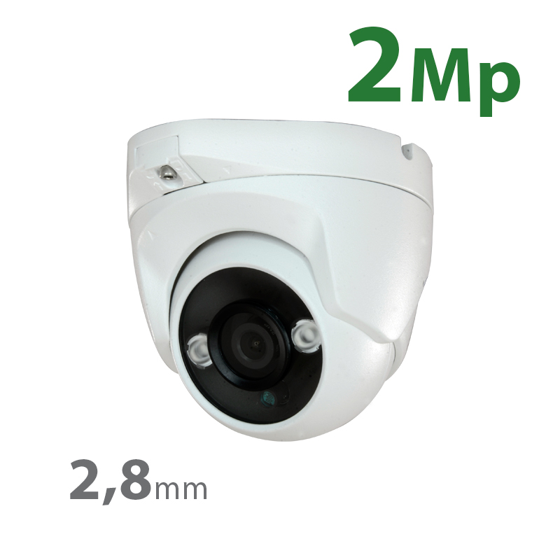 Telecamera Dome 4in1 ECO 2Mp 2,8mm IR 20m HD 1080p (1920×1080) a 25 FPS / CVBS 1000TVL, 0 Lux / IR LEDs 20m, Alimentazione: DC 12 V / 300 mA max. Dimensioni: 88 (Al) x 99 (Ø) mm. Colore bianco.