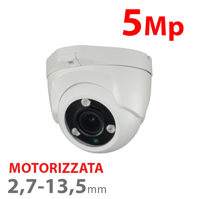 Telecamera dome HDTVI, HDCVI, AHD e Analogica Gamma ULTRA, 5Mp/4Mp 4 in 1 (HDTVI / HDCVI / AHD / CVBS) 1/2.8″ Sony© IMX335+FH8556. Lente Motorizzata 2.7~13.5 mm. IR LEDs Array autonomia 40 m WDR 120dB. Alta sensibilità Super Starlight. Alimentazione: DC 12 V / 1000 mA max. Dimensioni: 280 (P) x 60 (L) x 80 (H) mm. Diametro della base: 4 viti 70×70 mm. Compatibile con: SP205DM, SP205DMG junction box; PFA150 staffa da palo; PFA151 staffa ad angolo.